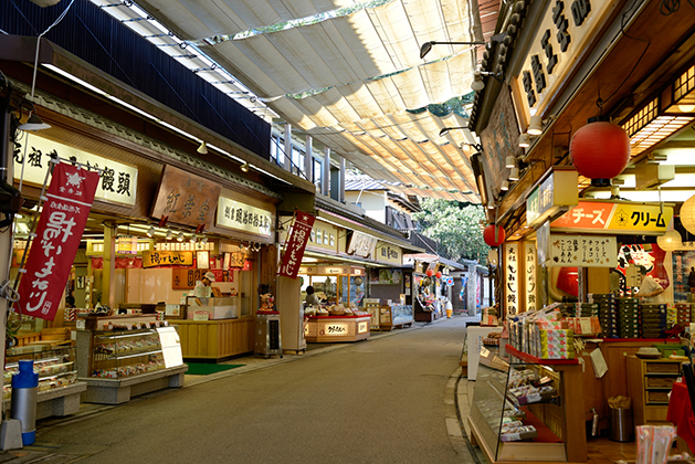 嚴島神社へと続く約350mの商店街。宮島杓子や宮島彫といった民芸品や土産物店、かきや穴子を使った宮島の名物グルメが味わえる店、もみじ饅頭店などが軒を連ね、お土産探しや飲食を楽しむ人々で賑わいます。