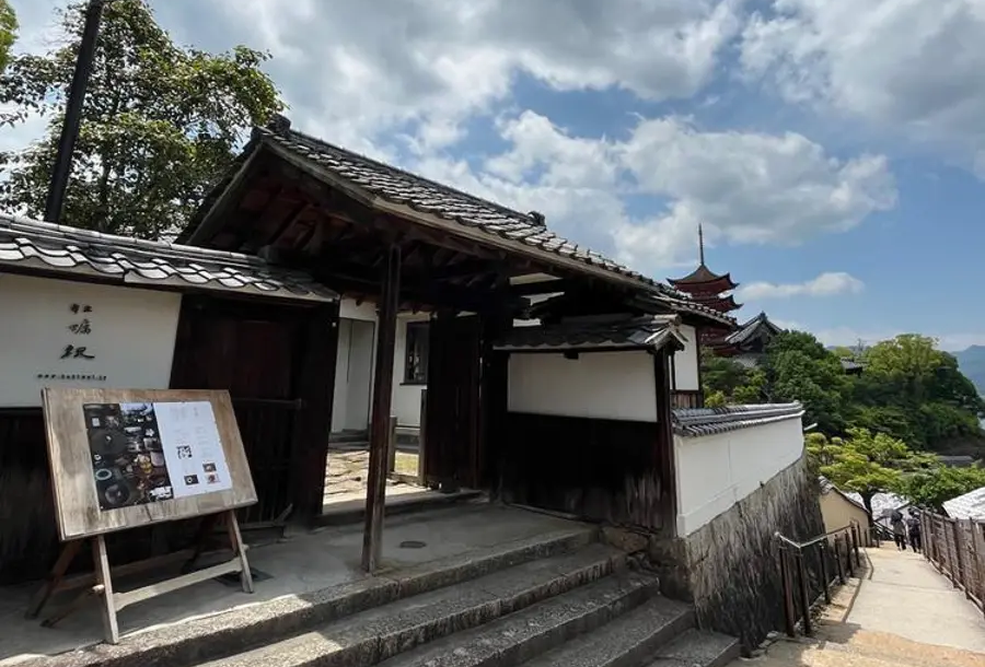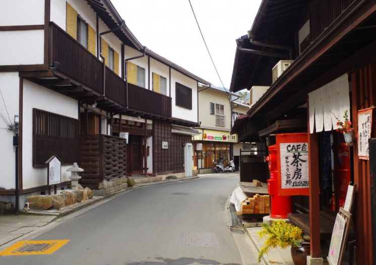 表参道商店街(清盛通り)から1本山側にあるこの通りは、伝統的な町家建築に現代的な感覚をプラスしたレトロモダンな宿や商店・ギャラリーなどが並びます。宮島桟橋から歩いてこの通りが終わる頃、五重塔が見えはじめ嚴島神社へと続いていきます。