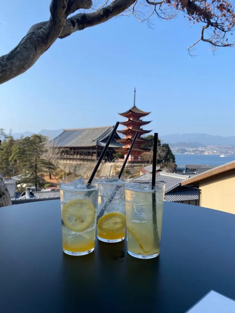 細道から階段を上がったところにある絶景が堪能できるカフェ。 テラス席は、五重塔と宮島の海、フェリーまで 見渡せて絶景です。