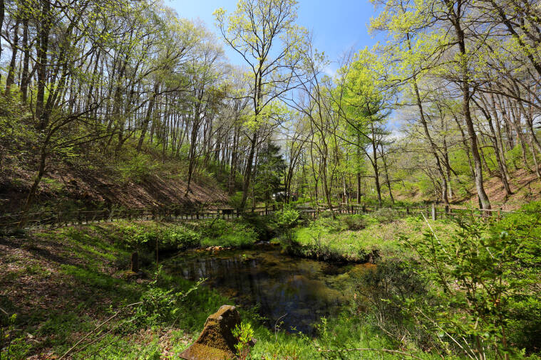 標高500mで、蒜山高原の木洩れ日の木立ちに囲まれた爽やかな土地に、湧出しているとっても魅力的な湧水池です。中国山地蒜山三座の真中、中蒜山(1,123m)の裾の谷間から湧き出ている冷泉です。